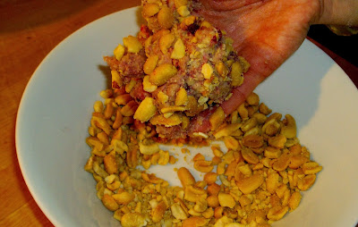 5. Poner en un plato los cacahuetes y con la masa hacer bolas y rebozarlas con los cacahuetes.